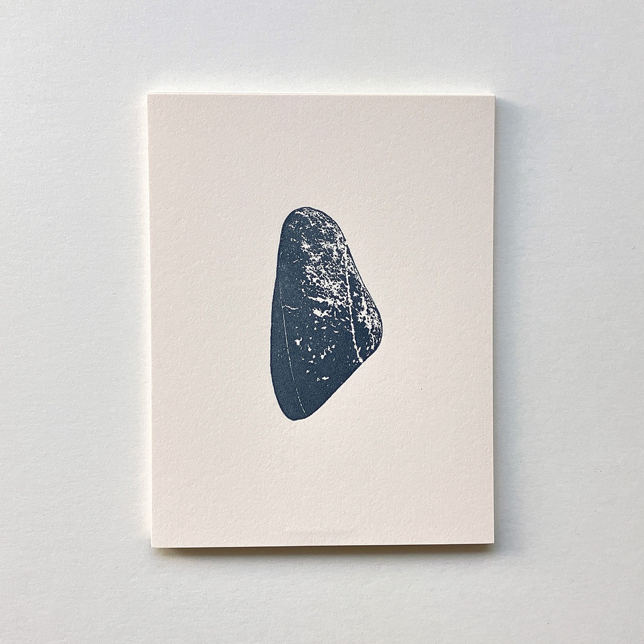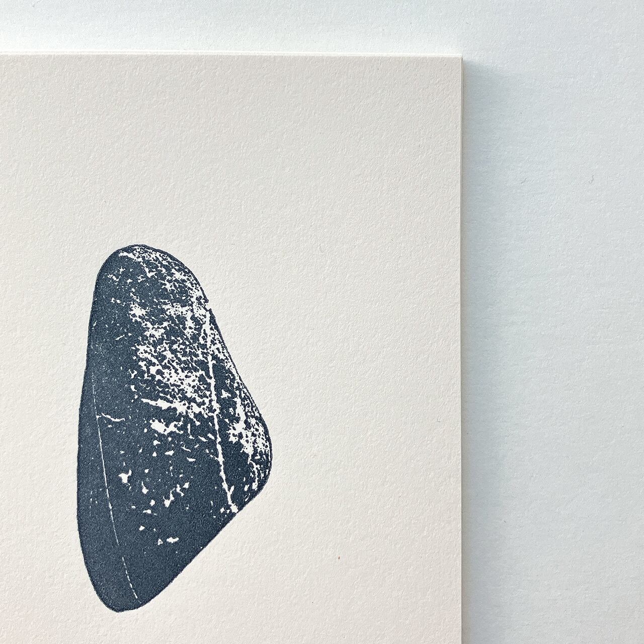 川原の石ころ。角が丸くなった石の中に細く白い線がのぞく姿を凸版印刷で紙に写しています。