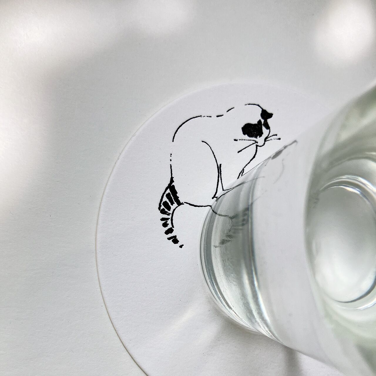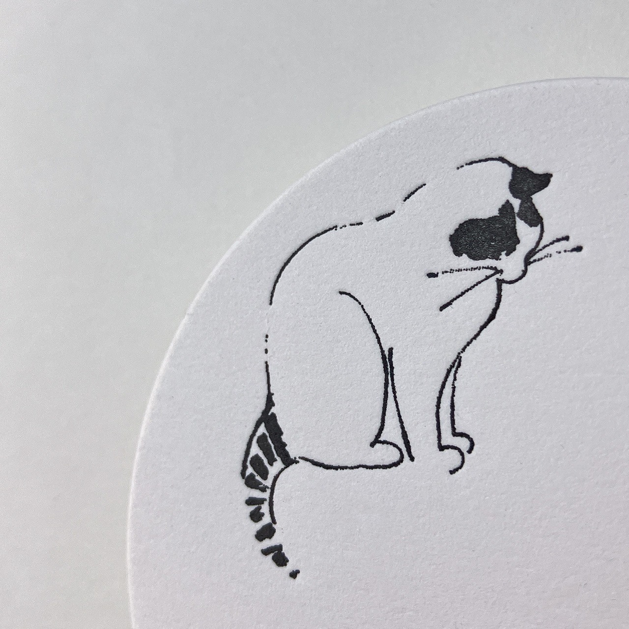 縞々の尻尾をくるりと巻いて座っている猫の姿をふかふかのコースターに印刷しています。