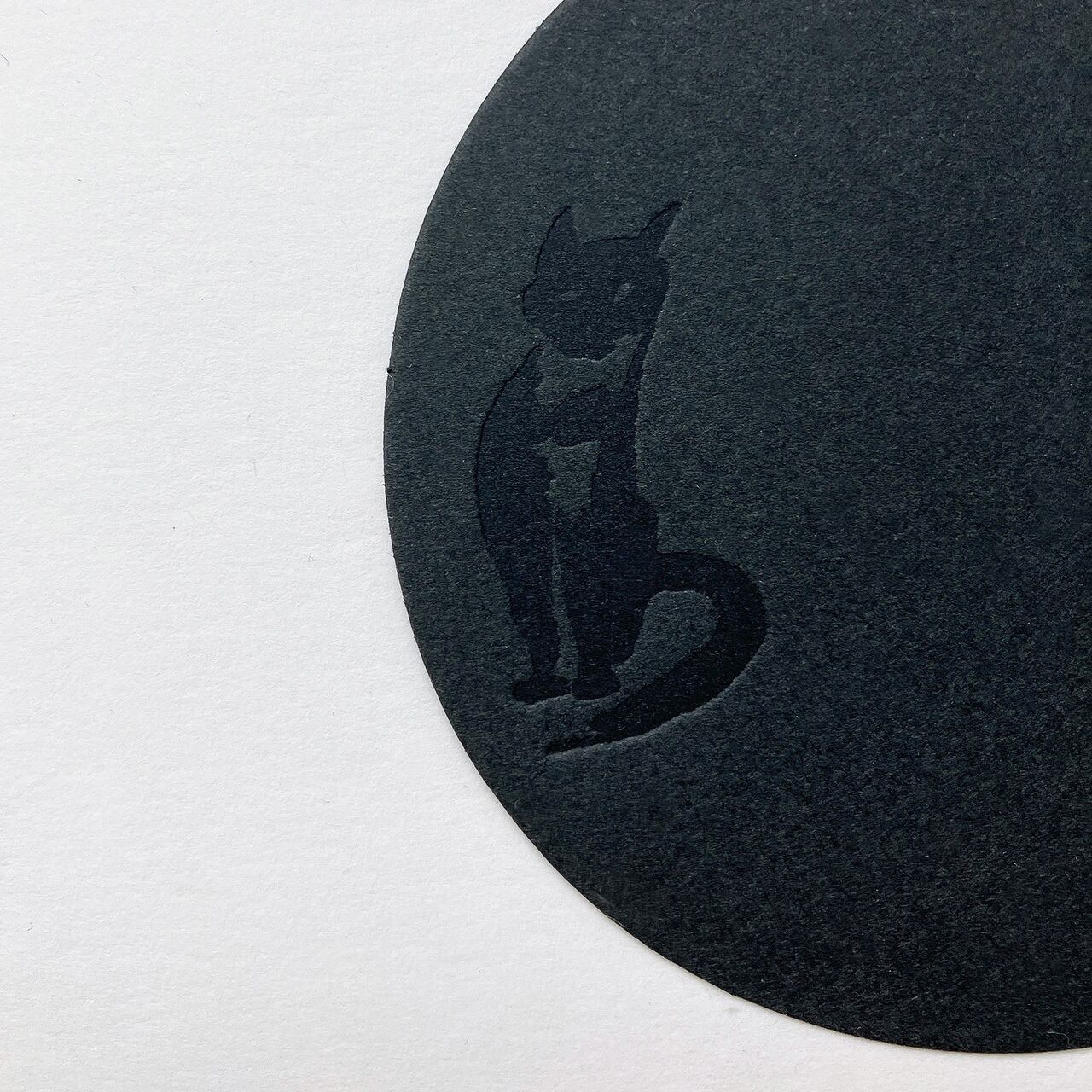 黒いコースターにきりりと佇む黒猫を印刷しました。艶々として浮かび上がるような仕上がりです。