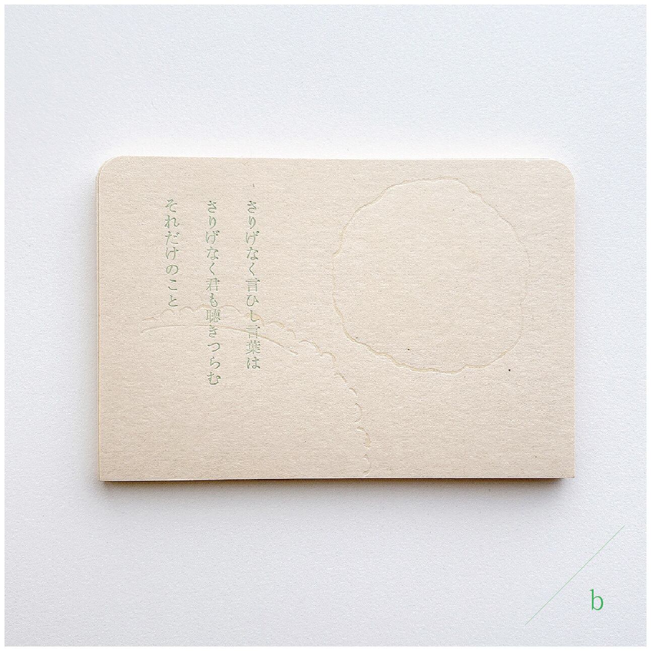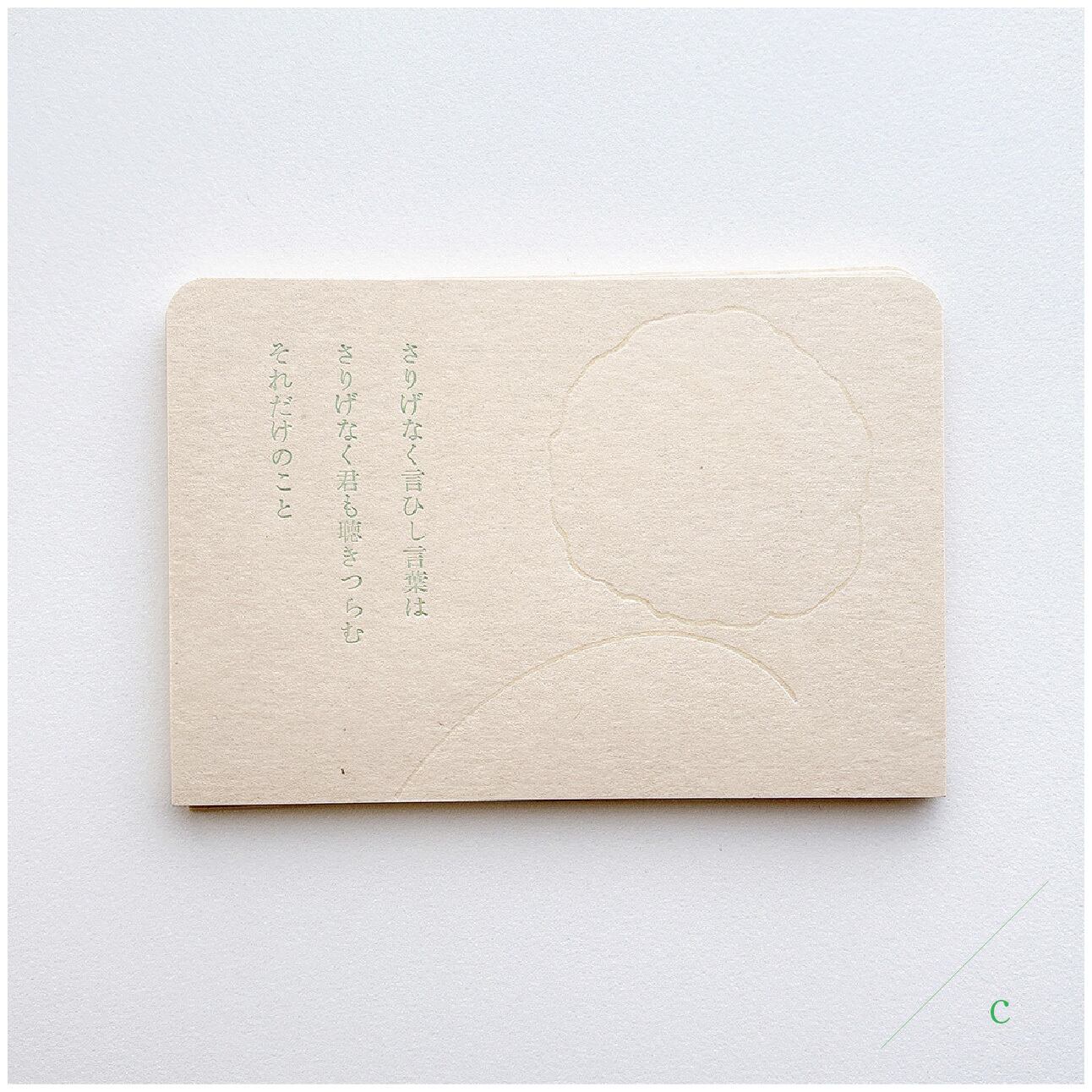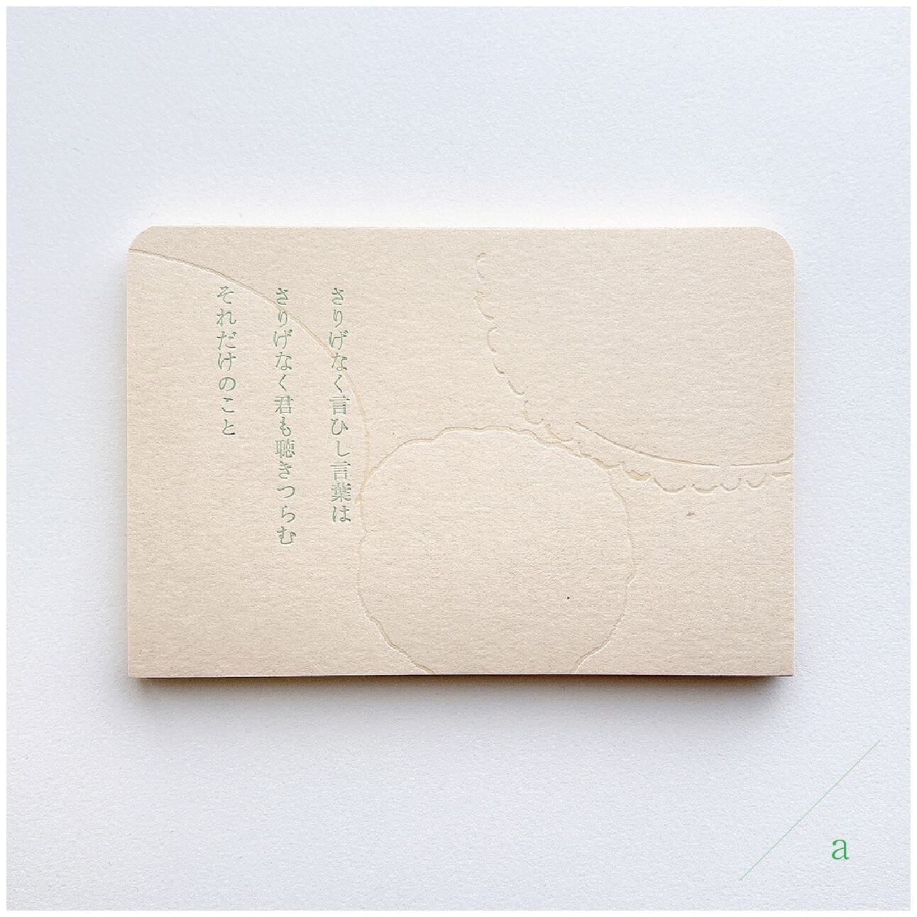 石川啄木の歌を甘い緑色で印刷し、緩やかなドローイングは透明なかたちに印刷しています。ドローイングのレイアウトが3種類ありますので下段の[種類を選択する]項目よりお選びください。