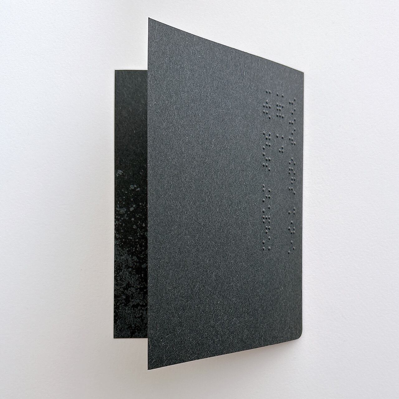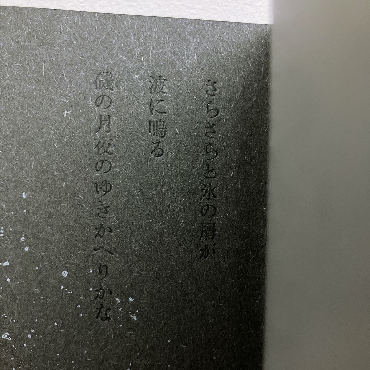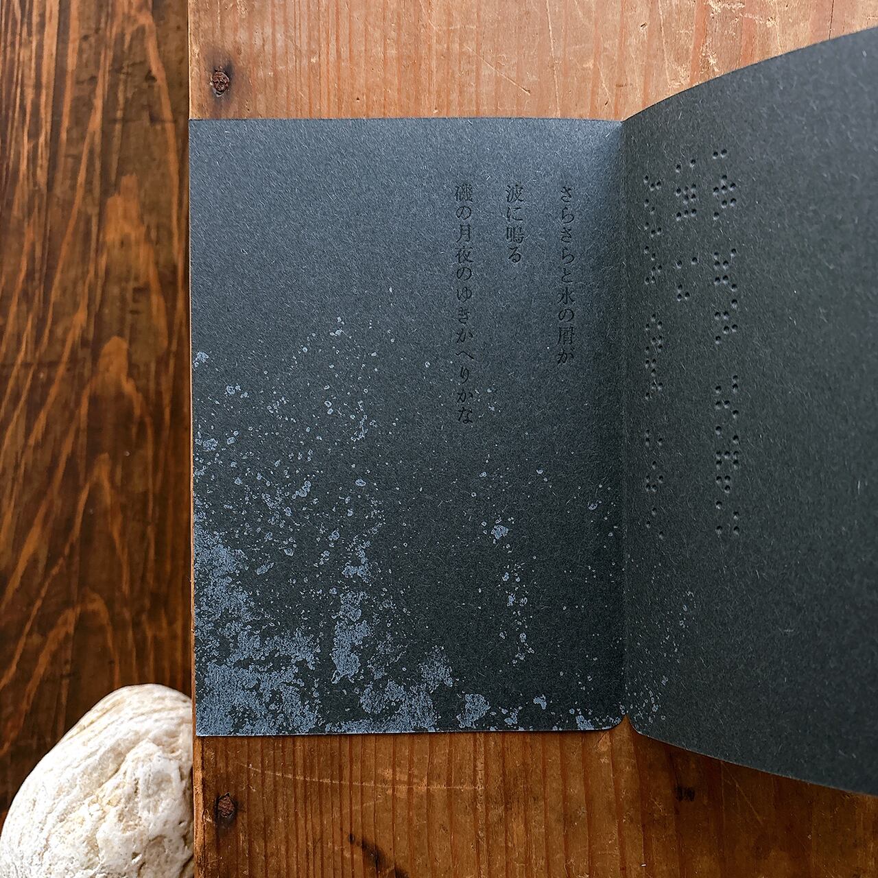 石川啄木の歌を点字と活字で記しました。木炭にも似た黒色の紙のおもてに三行書きの点字を、やわらかな紙を開くと白い氷の屑、歌を紙の色より深く印刷しています。