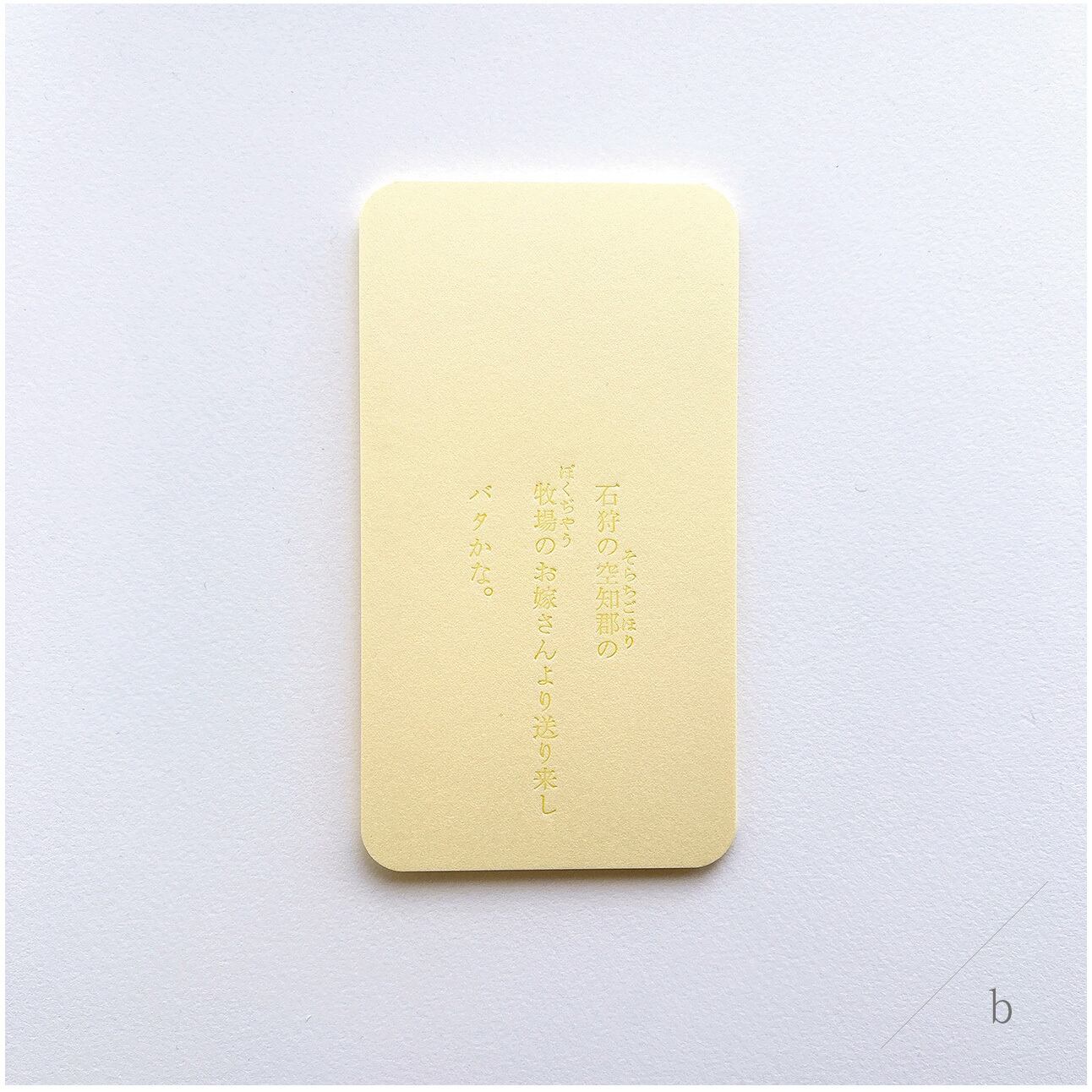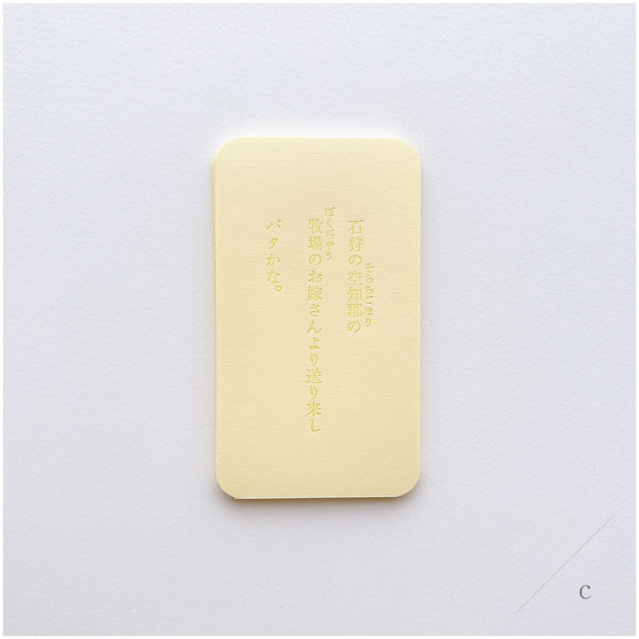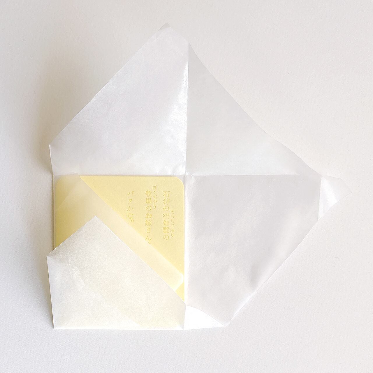 バターのかけらに見立てた淡いきいろの紙に、溶けたバターの色で石川啄木の歌を印刷しました。グラシン紙に包んでお届けいたします。4種類のかたちは下段の[種類を選択する]項目よりお選びください。