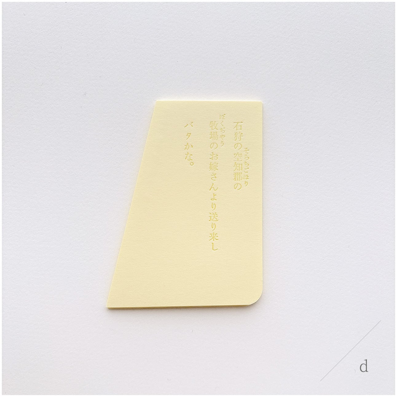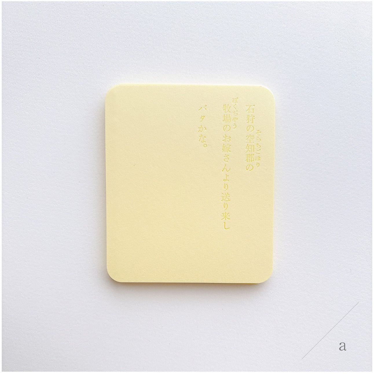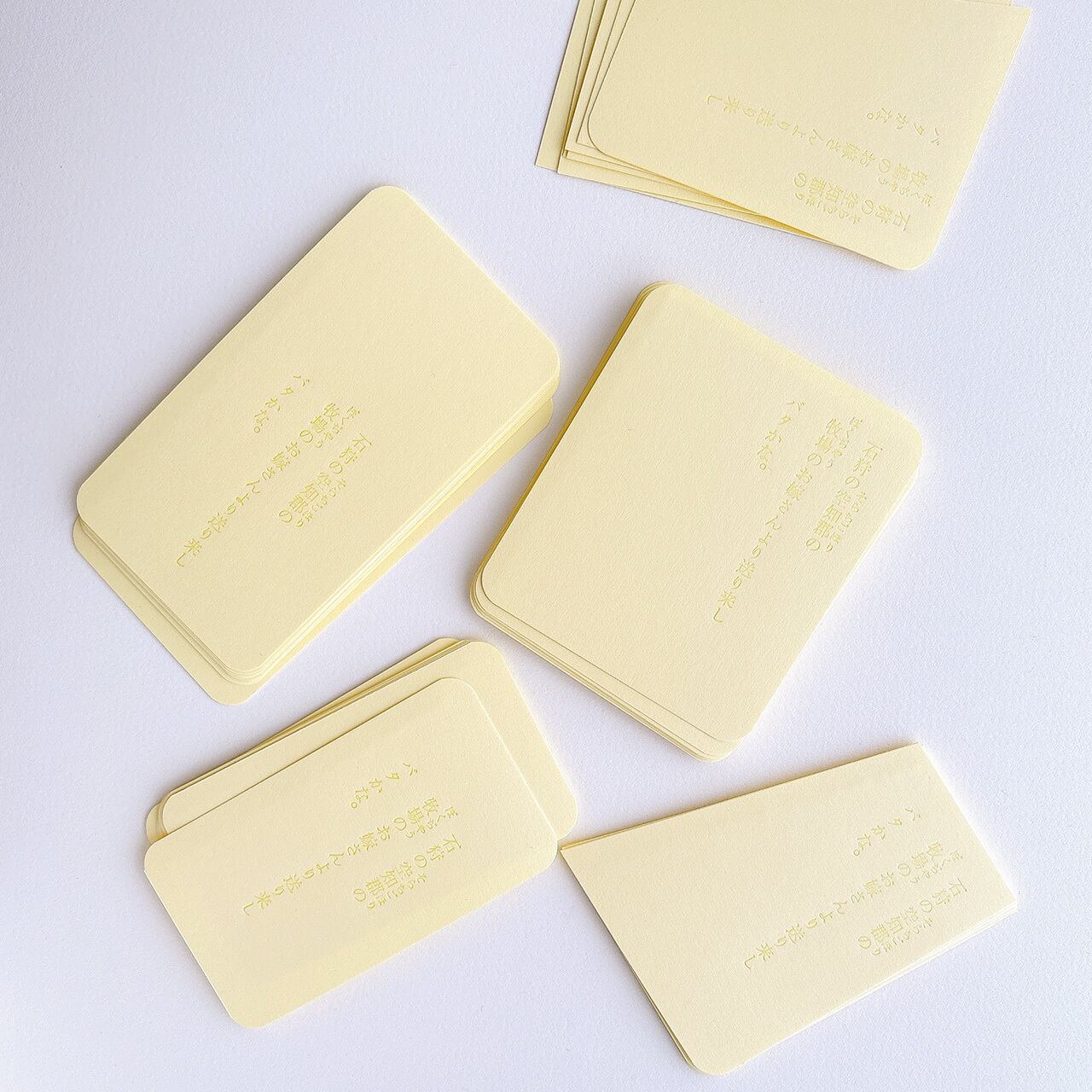 バターのかけらに見立てた淡いきいろの紙に、溶けたバターの色で石川啄木の歌を印刷しました。グラシン紙に包んでお届けいたします。4種類のかたちは下段の[種類を選択する]項目よりお選びください。