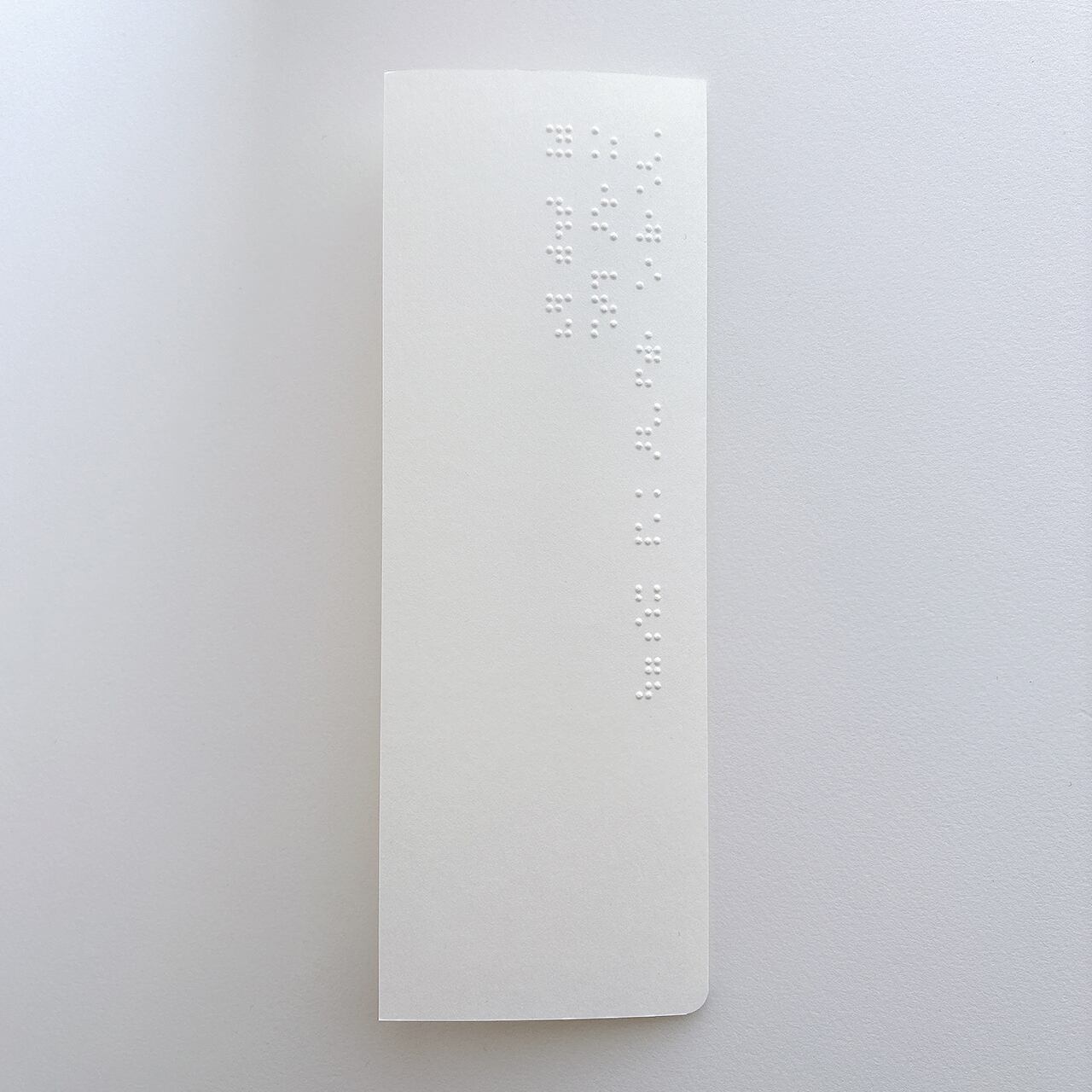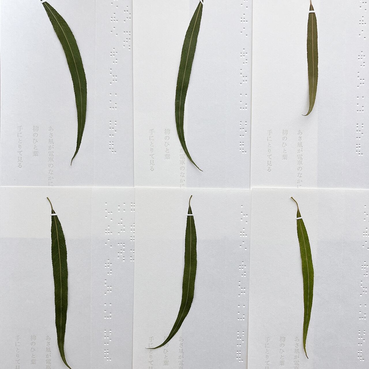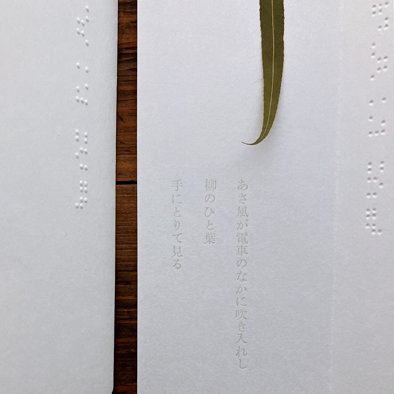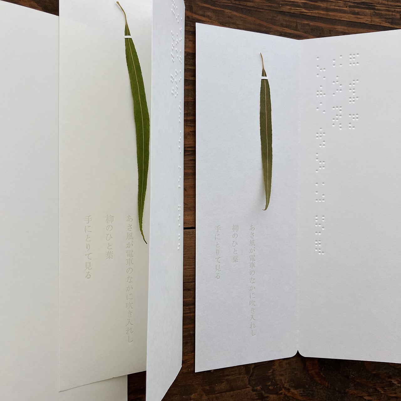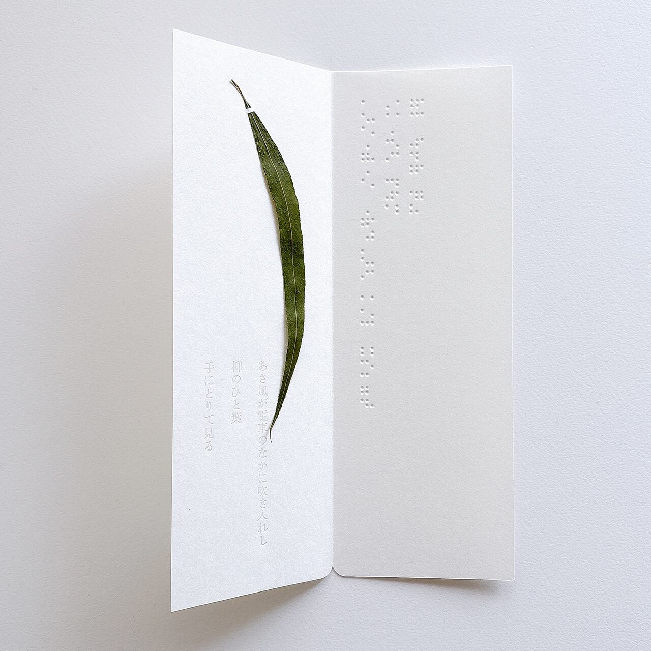 石川啄木の歌を点字と活字で記しました。白く細長い紙のおもてに三行書きの点字を、やわらかな紙を開くと夏の終わりに集めた柳のひと葉、歌は透明な色で印刷しています。